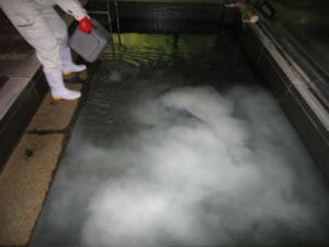 ▲洗浄剤レジオアタックLA ▲レジオアタック投入中 ▲循環洗浄中 ▲冷却塔槽内 清掃 ▲清掃後